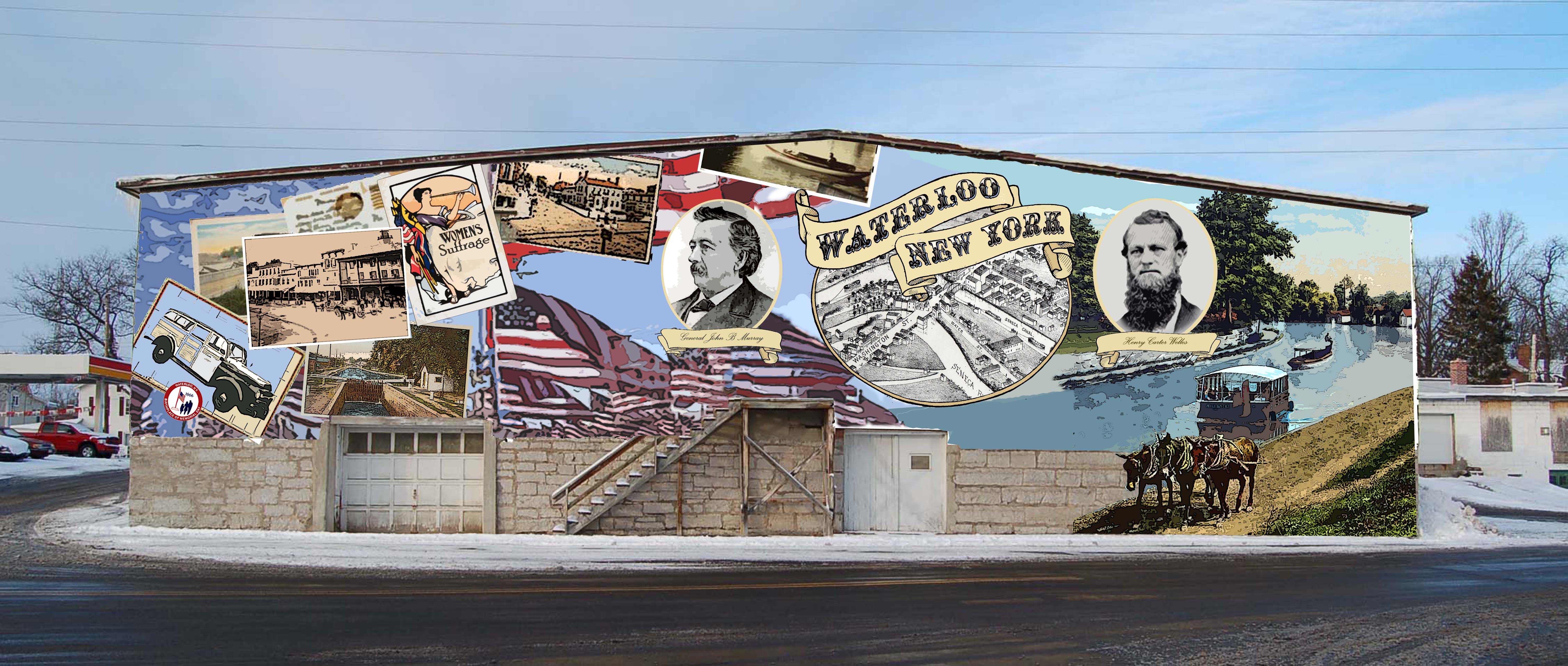 “Minetto’s Beautification Committee was interested in having a mural depicting a historical canal scene, on what was previously a buoy storage building for the Canal Corporation at the River View Park. The committee contacted Minetto Elementary School art teacher, Crystal Mason. With the help of Crystal’s art club, they researched historical canal scenes, with the club drawing and creating the image for the mural.