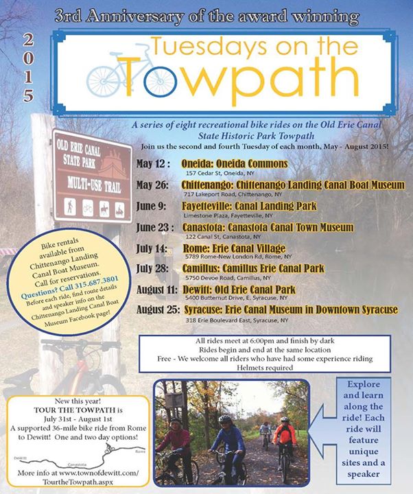 Spring means the beginning of peak bicycle riding season along the Erie Canalway Trail. From May through August, one way to enjoy the trail in Central New York is to join other riders after work for Tuesdays on the Towpath.