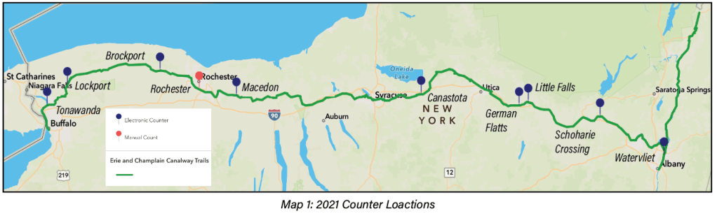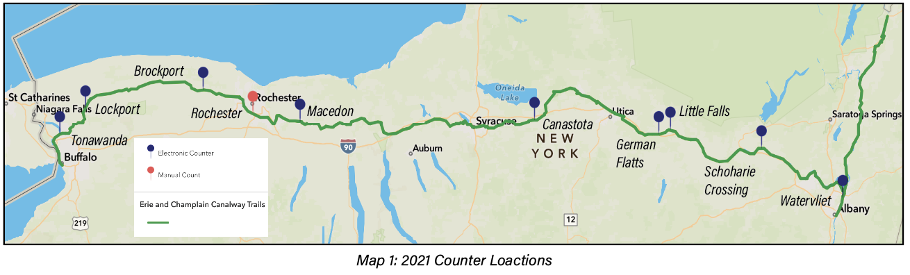 Use estimates are based on electronic and manual counts conducted by PTNY at ten locations along the Erie Canalway Trail in 2021. Electronic counters recorded usage at Tonawanda (Erie County), Pendleton (Niagara County), Brockport (Monroe County), Macedon (Wayne County), Canastota (Madison County), German Flatts and Little Falls (Herkimer County), Schoharie Crossing (Montgomery County), and Watervliet (Albany County). Four of the nine counters had been in place since 2020, so this report is able to show some changes in usage patterns between 2020 and 2021. Manual counts were also conducted at one location, in Rochester (Monroe County).