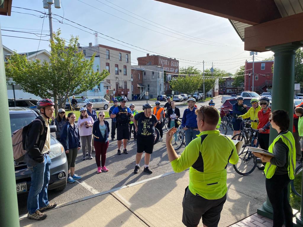 The listening session was the perfect way to get everyone talking about the things that can impact their day-to-day life outside, and what better place to continue those conversations than from the saddle of a bicycle? Guided by staff from Parks & Trails New York, the NYS Canal Corporation and volunteers from Walk! Bike! Brockport! Action Group, a 7-mile “slow roll” style bike ride around the Village was scheduled for the following day. Along the way, riders were encouraged to stop to talk about the unique assets and characteristics within Brockport that can either attract or deter users – ranging from adequate signage to the condition of sidewalks. The ride allowed everyone to experience the Village as if they were visiting cyclists, experiencing the community from a different perspective. While getting out on a bike is fun, it can also be illuminating. Participants can talk openly about their experience, and these experiences can help shape policies within the Village to meet the needs of cyclists and pedestrians.