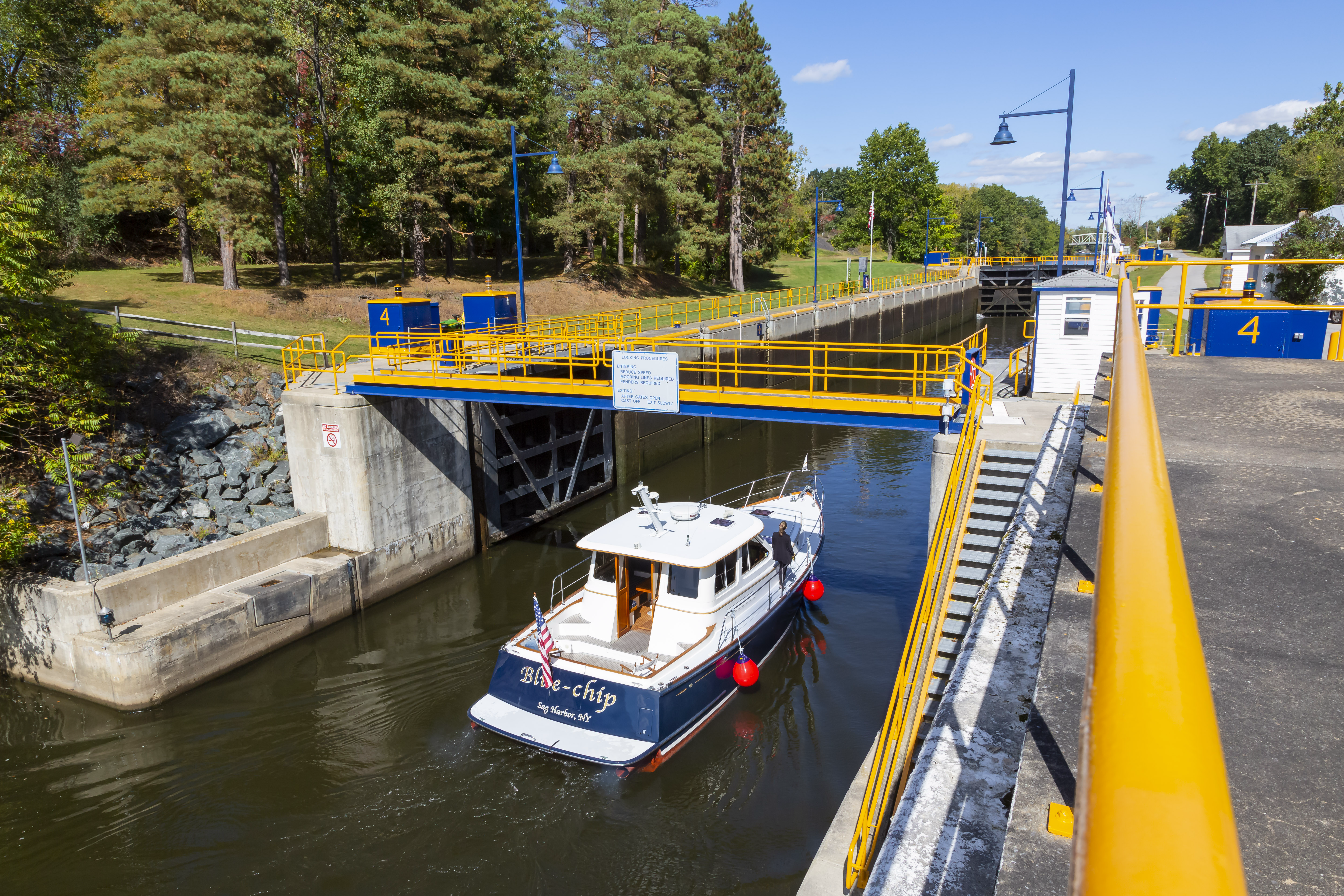 Today, not only is the Champlain Canal still utilized for commercial shipping of local products, including aggregate stone from the Adirondacks used for construction in the greater New York City region, but it is also home to recreational boating. The Champlain Canal is a main thoroughfare for Canadian boaters, connecting hundreds of miles of the Quebec Canals to the Atlantic Ocean and the St. Lawrence Seaway. The Champlain Canal is part of the popular “Mini Loop” or “Triangle Loop”, the 700-mile alternative to the “The Great Loop,” where vessels cruise north from the Atlantic Ocean through the Hudson River, Lake Champlain, Richelieu River, and Chambly Canal, southwest along the St. Lawrence River, the Rideau Canal, Lake Ontario, then south on the Oswego and east on Erie canals back to the Hudson.