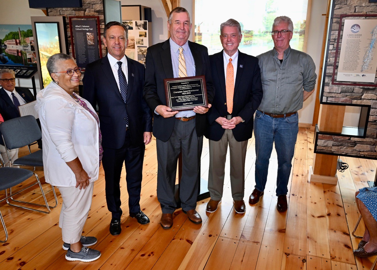 Last month in Schuylerville, Governor Hochul commemorated the bicentennial of the historic Champlain Canal which officially opened in September of 1823. During an event at the Champlain Canal Region Gateway Visitors Center, New York Power Authority President and CEO Justin E. Driscoll and New York State Canal Corporation Director Brian U. Stratton presented Historic Hudson Hoosic Rivers Partnership Chairman Tom Richardson with a commemorative plaque that will be displayed at the Visitors Center to mark the occasion.